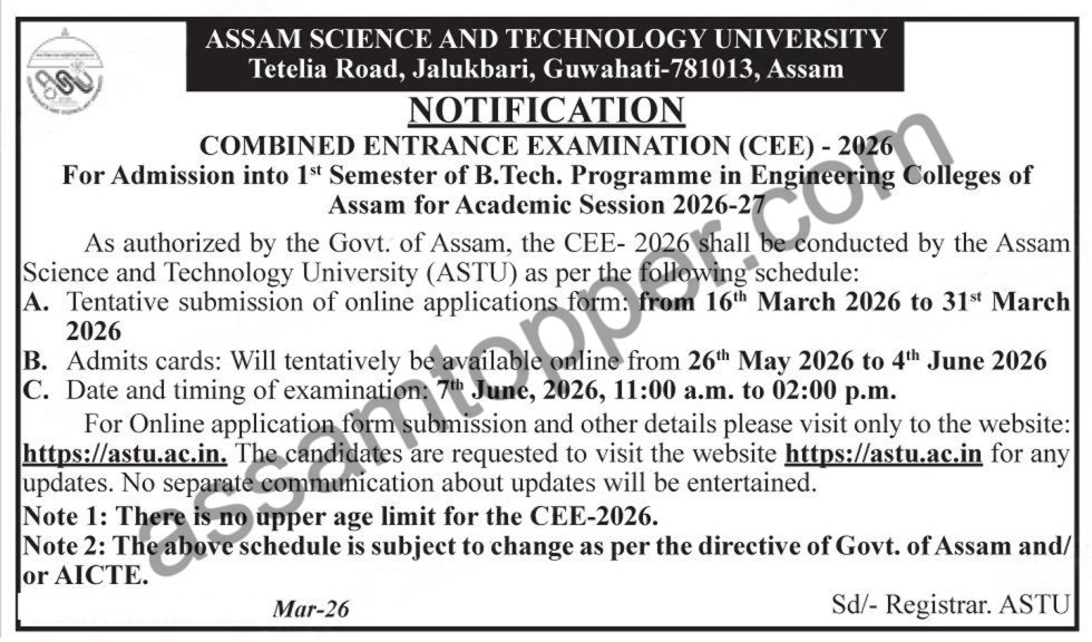 This year, the Assam Science and Technology University has officially released the notification for CEE 2026, and the application process has already started.
